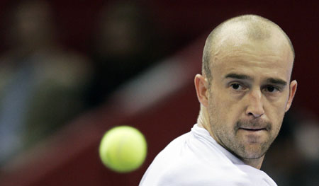 Ivan Ljubicic of Croatia eyes the ball before returning it to Britain's Andy