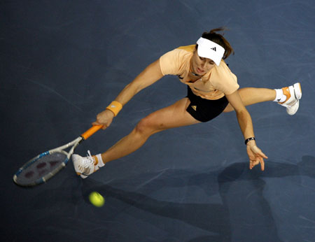 Switzerland's Martina Hingis hits a forehand to France's Nathalie Dechy