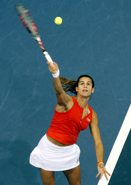 France's Amelie Mauresmo serves to Australia's Samantha Stosur during their