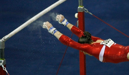 bars during the finals of the women's team event at the Artistic Gymnastics