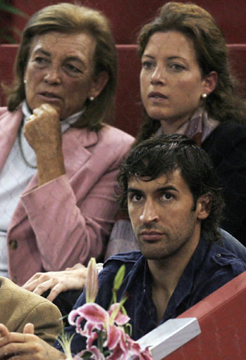 Real Madrid's Raul (R) sits next to unidentified spectators as he watches a tennis match at the Madrid Masters Series tennis tournament, October 19, 2006. [Reuters]