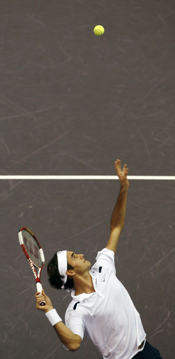 Switzerland's Roger Federer serves the ball to