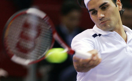 Switzerland's Roger Federer returns the ball to Chile's Fernando Gonzalez during their final match at the Madrid Masters Series tennis tournament October 22, 2006. [Reuters]