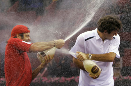 Switzerland's Roger Federer (R) and Chile's Fernando Gonzalez spray champagne at each other after their final tennis match at the Madrid Masters Series tennis tournament, October 22, 2006. [Reuters]