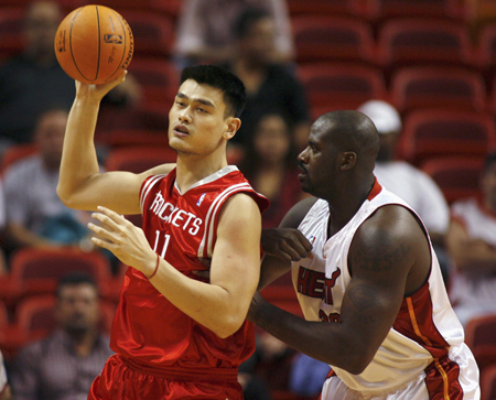 Miami Heat center Shaquille O'Neal (R) defends Houston Rockets center Yao Ming from China during their NBA pre-season basketball game in in Miami, Florida, October 25, 2006. [Reuters]