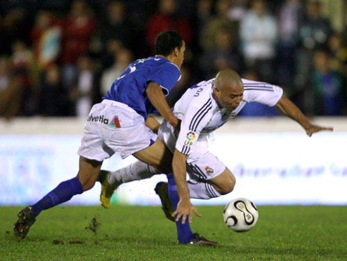 Real Madrid's Ronaldo (R) of Brazil is tackled by Ecija's Arguello during the King's Cup soccer match at Ecija's San Pablo stadium October 25, 2006. [Reuters]