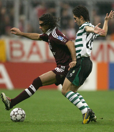 (L) is challenged by Sporting Lisbon's midfielder Joao Moutinho during their