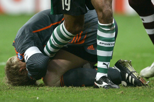 Munich's goalkeeper Oliver Kahn lies on the pitch with the feet of Sporting