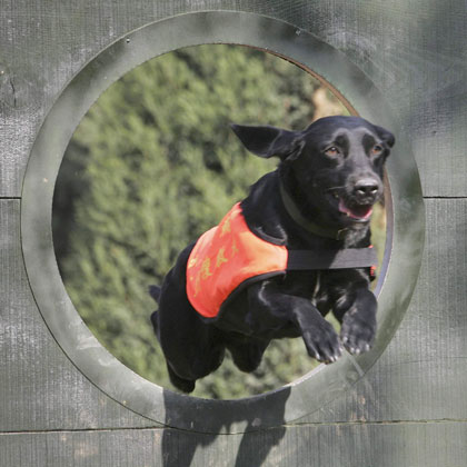 A rescue dog undergoes training inside a fire-fighting base in Beijing November 1, 2006. Beijing's first rescue dog squad, which will be used for disaster relief, are being trained for the 2008 Olympics, local media reported. [Reuters]