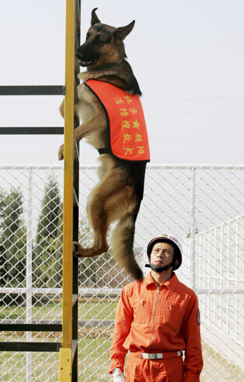 A rescue dog undergoes training inside a fire-fighting base in Beijing November 1, 2006. Beijing's first rescue dog squad, which will be used for disaster relief, are being trained for the 2008 Olympics, local media reported. [Reuters]