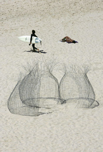 A sunbather lies near a work titled "Turpentine Flower" by Australian artist Mandy Francis, as part of the annual Sculptures by the Sea exhibition that runs along the foreshore from Bondi Beach to Tamarrama, while a surfer runs past on Sydney's Tamarrama Beach November 1, 2006. Over 100 sculptors participated in the tenth year of one of the world's largest outdoor art exhibitions. [Reuters]