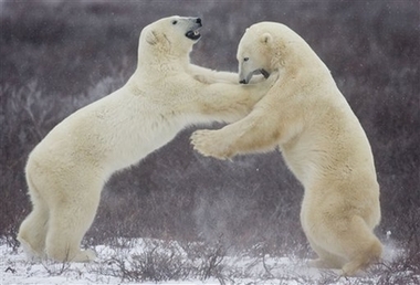 Polar bears play on the tundra near Churchill, Manitoba, Canada, Friday Nov. 3, 2006.[AP]
