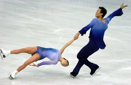 China's Shen Xue, top and Zhao Hongbo perform during the Pairs Free Skating at the ISU Grand Prix of Figure Skating Cup of China in Nanjing, in China's eastern Jiangsu province Friday Nov. 10, 2006. The two won the pairs competition. [AP/Xinhua]