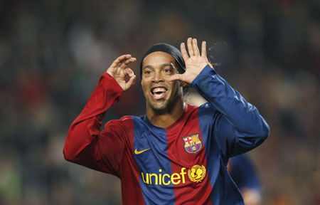 Barcelona's Ronaldinho of Brazil celebrates a goal against Villarreal during their Spanish First Division soccer match in Barcelona November 25, 2006. [Reuters]