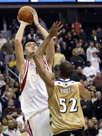 Houston Rockets Yao Ming (L) puts up a jump shot over Washington Wizards Calvin Booth in the closing minutes of the fourth quarter during their NBA game in Washington December 9, 2006. [Reuters]
