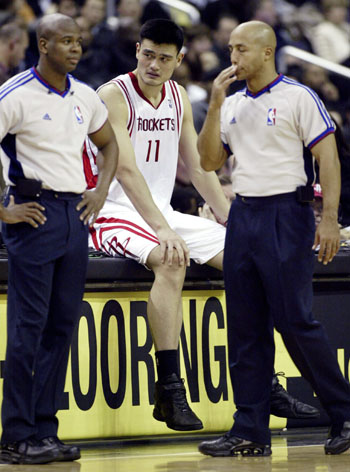 Houston Rockets Yao Ming sits on the scorers' table between referees Sean Wright (L) and Marc Davis (R) during a power failure as several lights went out in the arena, at the end of the third quarter of their NBA game against the Washington Wizards in Washington December 9, 2006. [Reuters]
