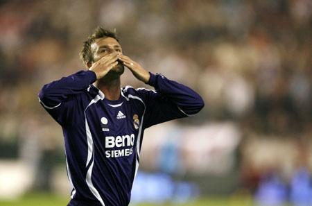 Real Madrid's David Beckham celebrates after scoring against Sevilla during their Spanish first division soccer match at the Ramon Sanchez Pizjuan stadium in Seville December 9, 2006. [Reuters]