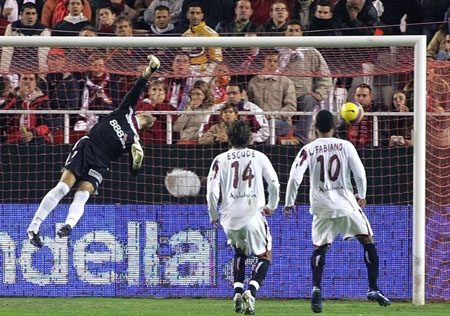 scores past Sevilla's goalkeeper Andres Palop (L) during their Spanish first
