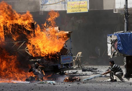A man tries to help victims moments after a car bomb attack along a road in Baghdad June 14, 2006.[Reuters]