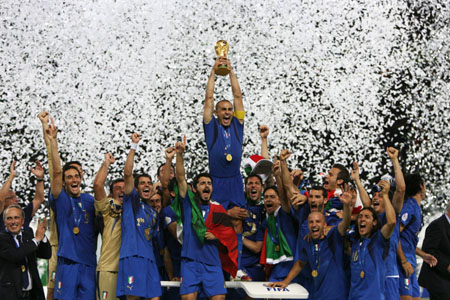 Trophy as he celebrates with team mates after the World Cup 2006 final soccer