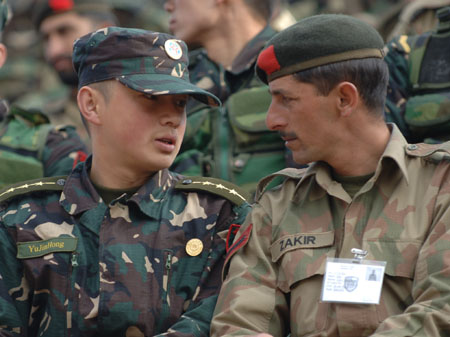 A Chinese soldier (L) talks with a Pakistani serviceman during a Sino-Pakistan joint counter-terrorism exercise held near Islamabad, December 14, 2006. [Xinhua]