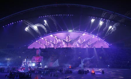 Fireworks explode over the Khalifa Stadium during an enactment of the story of Aladdin and his lamp during the closing ceremony of the 15th Asian Games in Doha December 15, 2006. [Reuters]