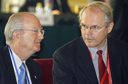 Hill (R) and U.S. Ambassador to China Clark Randt attend six-party talks