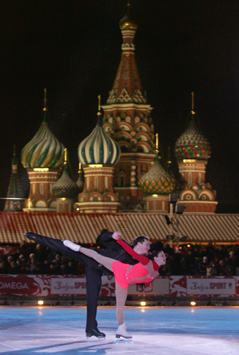 Maria Petrova and Alexey Tikhonov perform during a gala figure skating show in front of St Basil's Cathedral in Red Square in Moscow December 19, 2006. [Reuters]