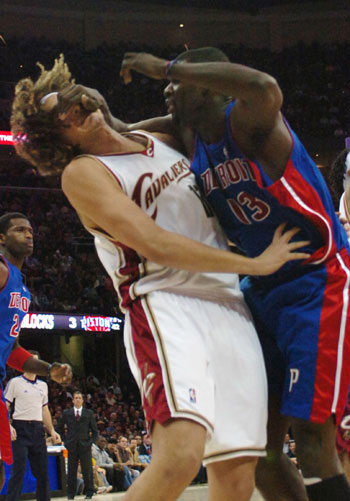 Anderson Varejao (L) of the Cleveland Cavaliers gets a hand in the face from Nazr Mohammed (R) of the Detroit Pistons while going for a rebound in the fourth quarter of their NBA game in Cleveland, Ohio December 21, 2006. [Reuters]