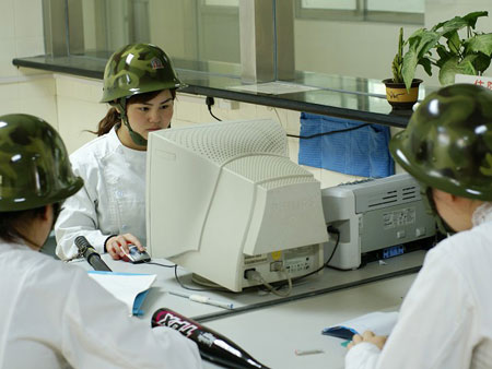Staff members work while wearing helmets at a hospital in Shenzhen, south China's Guangdong Province December 24, 2006. The crew of the hospital all wear helmets in case that relatives of a patient who died in the hospital come and strike. [Guangzhou Daily]