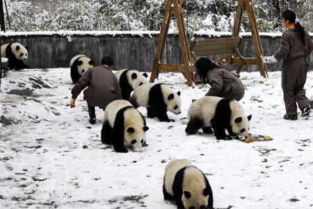 Breeders feed pandas on the snow at the Research and