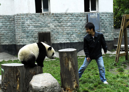 A caretaker plays around with a giant panda at the Research and Conservation Center for Giant Panda in Wolong Nature Reserve, southwest China's Sichuan Province in this undated photo. Playing games with pandas is one of the feeders' duties. [newsphoto]