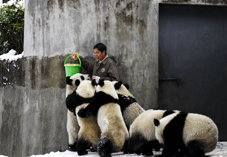 Breeders feed pandas on the snow at the Research and Conservation Center for Giant Panda in Wolong Nature Reserve, southwest China's Sichuan Province in this undated file photo. [newsphoto]