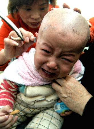 A boy cries as he receives a haircut in Lanzhou, Northwest China's Gansu Province, March 1, 2006. It's February 2 on the Chinese lunar calendar, and many people had their hair cut to mark the day. [Pei Qiang/Lanzhou Morning News]