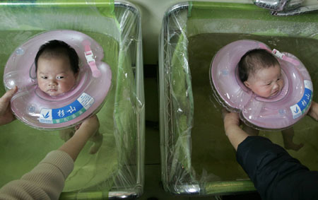 Newborn babies exercise as they float in water at a hospital in Shanghai January 23, 2007. It could take up to 15 years for China's gender imbalance to sort itself out, the country's top family planner said on Tuesday. [Reuters]