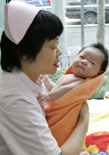 A nurse holds a newborn baby at a hospital in Shanghai January 23, 2007. It could take up to 15 years for China's gender imbalance to sort itself out, the country's top family planner said on Tuesday. [Reuters]