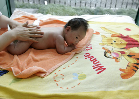 A nurse massages a newborn baby at a hospital in Shanghai January 23, 2007. It could take up to 15 years for China's gender imbalance to sort itself out, the country's top family planner said on Tuesday. [Reuters]