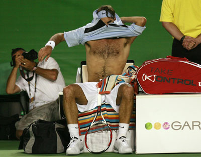 Switzerland's Roger Federer changes his shirt during his quarter-final match against Spain's Tommy Robredo at the Australian Open tennis tournament in Melbourne January 23, 2007. [Reuters]