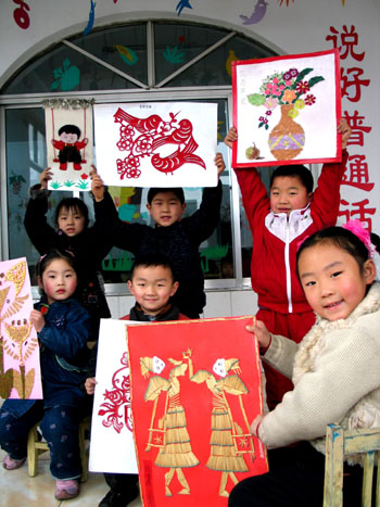 Children display greeting cards they made at a kindergarten in Zouping, east China's Shandong Province January 25, 2007. They made the cards with rags, colored papers, and matches to celebrate the upcoming Lunar New Year. [Xinhua]