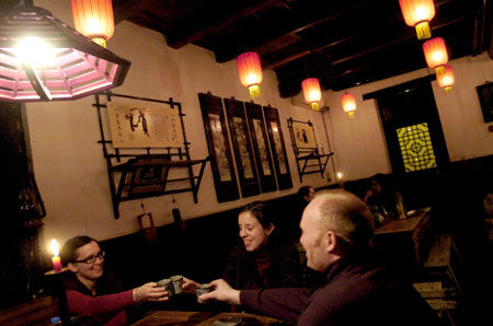 Three Swiss tourists drink tea at a tea shop in the ancient city of Pingyao, north China's Shanxi Province February 23, 2007. Nearly 10,000 tourists are spending the Lunar New Year holiday in Pingyao this year, according to local authorities. [Xinhua]