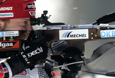 Germany's Daniel Graf shoots during the men's 4 x 7.5 km relay at the European Biathlon Championship in the ski resort of Bansko, southwestern Bulgaria, February 25, 2007. [Reuters]