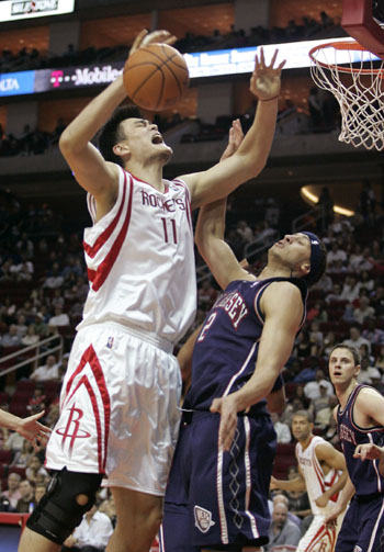 from the hands of Houston Rockets center Yao Ming during the first half of their