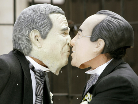 Bush (L) and Mexican President Felipe Calderon enact a 'wedding' during a