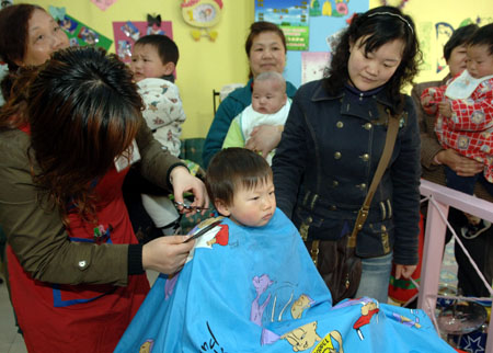 Babies are brought to a barber's to have their hair cut in Huaibei, east China's Anhui Province on March 20, or the second day of the second month in the new year on the Lunar Calendar, a traditional day in China for haircut. [Xinhua]