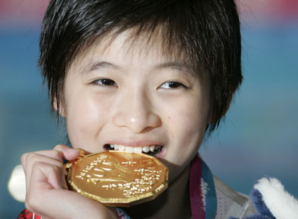 China's Wang Xin bites her gold medal after winning the women's 10-meter competition at the World Aquatic Championships in Melbourne March 21, 2007. [Reuters]