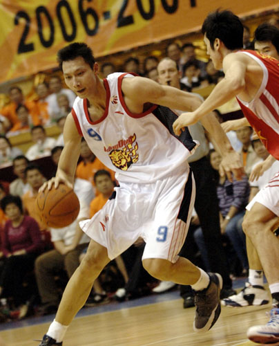 Yi Jianlian of Guangdong Hongyuan drives the ball during the final match of the Chinese Basketball Association (CBA) league Wednesday, March 28, 2007. Bayi won the final series by 4-1 to deny Guangdong's hope for the fourth title in a row. [Xinhua]