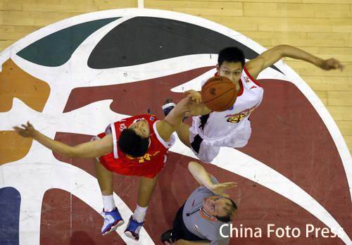 Yi Jianlian (R) of Guangdong Hongyuan and Mo Ke of Bayi Fubang jump the ball during the final match of the Chinese Basketball Association (CBA) league Wednesday, March 28, 2007. Bayi won the final series by 4-1 to deny Guangdong's hope for the fourth title in a row. [China Foto Press]