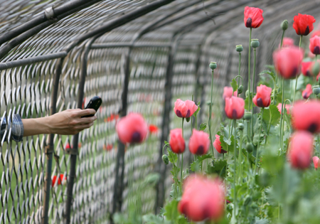A park visitor takes a photo of opium poppies using his mobile phone at a botanic garden in Wuhan, central China's Hubei Province, April 10, 2007. The garden campaigns every year calling on citizens to keep away from drugs which could be yielded from poppy capsules. [newsphoto]