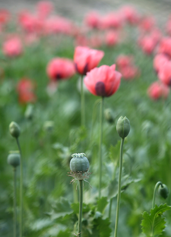 Opium poppy capsules and flowers are seen at a botanic garden in Wuhan, central China's Hubei Province, April 10, 2007. The garden campaigns every year calling on citizens to keep away from drugs which could be yielded from poppy capsules. [newsphoto]