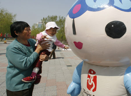 A woman and child look at a Beijing Olympic mascot during the launching ceremony of "Green Dreams, Colorful Olympics" 2007 International Painting Contest for primary and middle school students at a park in Beijing April 13, 2007. [Reuters]